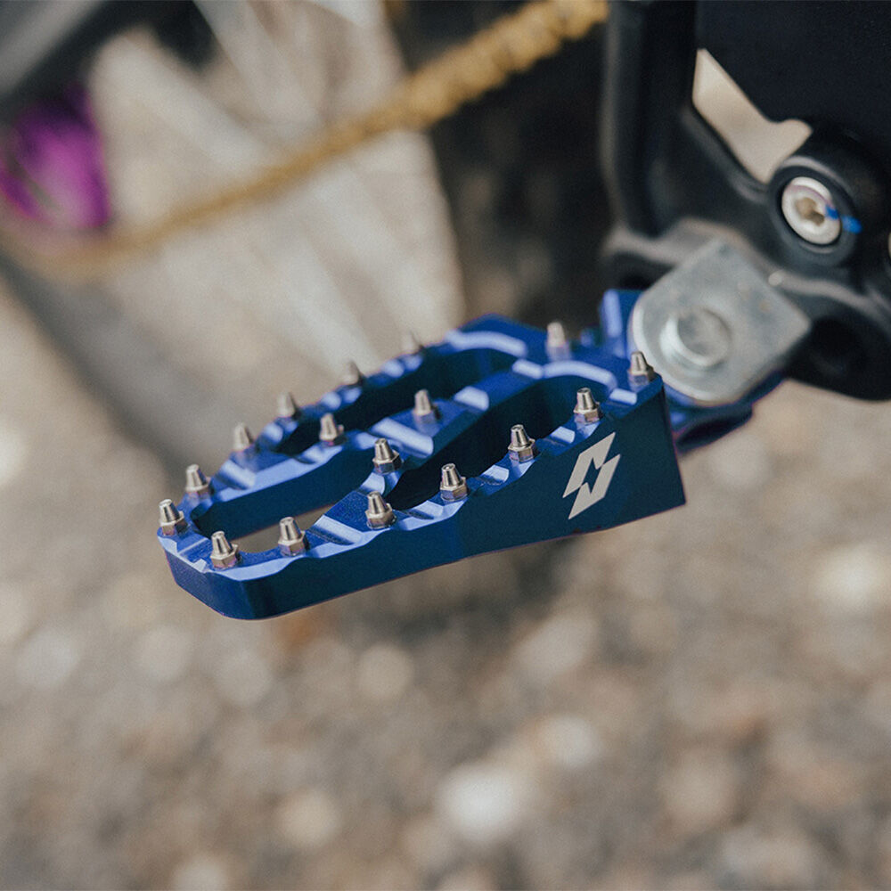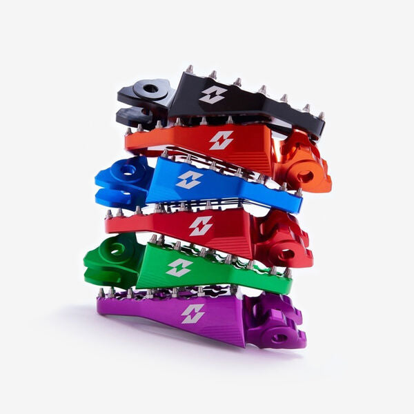 Upgrade your riding stance with our wide footpegs providing you with more stability control and comfort. Perfect for anyone riding out there for hours, racing or just simply wanting some cool upgraded pegs to match