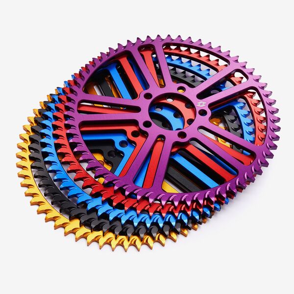 Choose from sprocket sizes ranging from 54T to 58T, providing you with a variety of options to customise your ride. Additionally, our sprockets come in six vibrant colours, allowing you to make a bold statement while optimising your bikes performance.