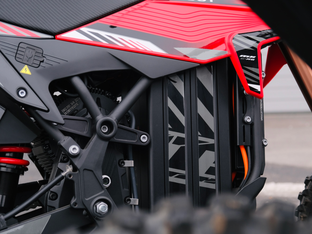 Dank des 72-Volt Lithium-Ionen-Akkus und einer Peak-Leistung von 6,5 kW liefert das Kinder-Motocross-Bike ordentlich Vortrieb, bleibt dabei aber jederzeit gut kontrollierbar. Ideal für Training, Freizeit und erste Rennerfahrungen.